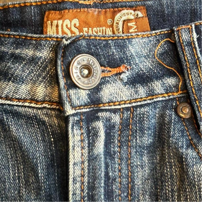 Y2K , asymmetrical, flared denim skirt with embroidery and ruffle detailing.