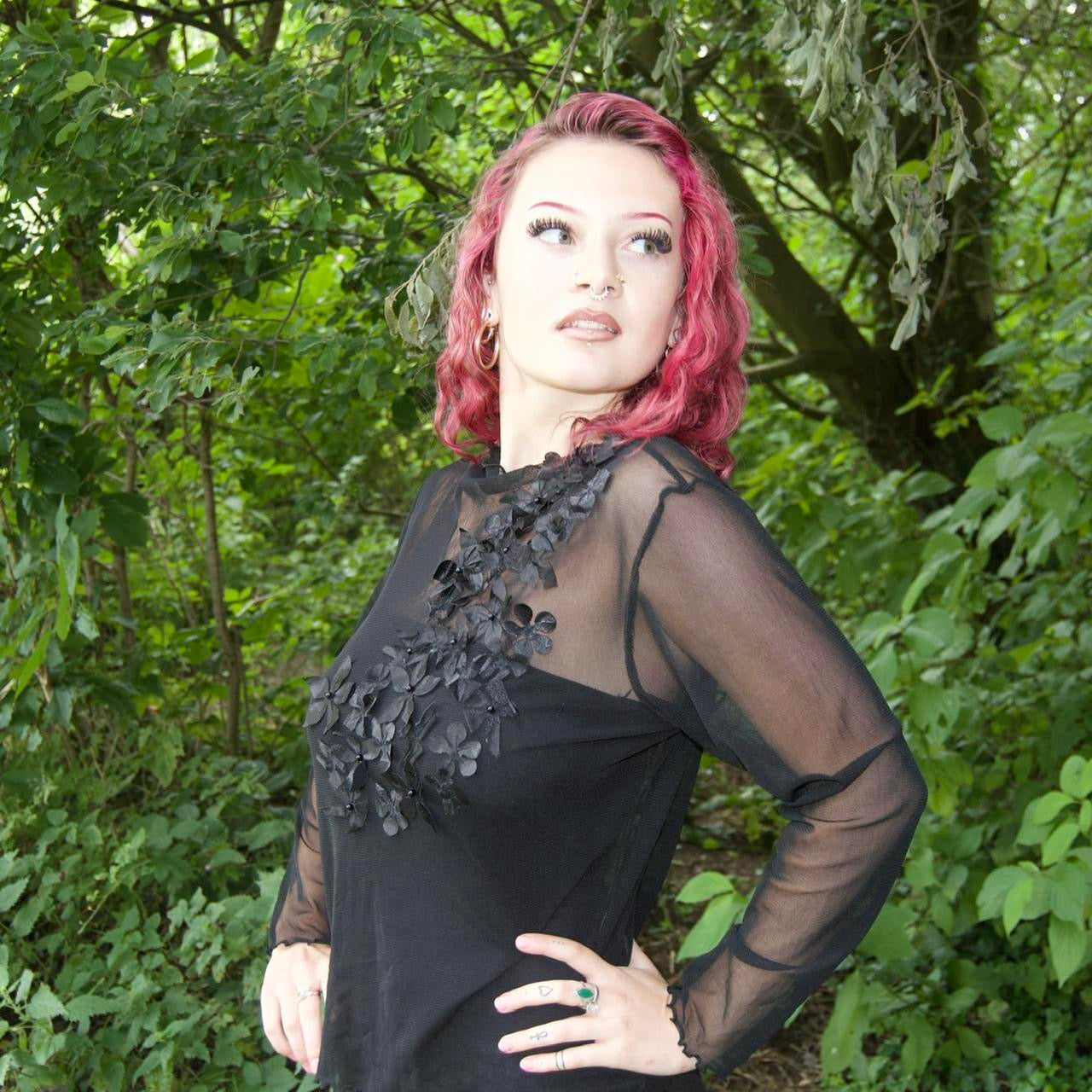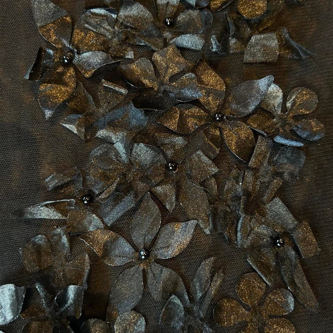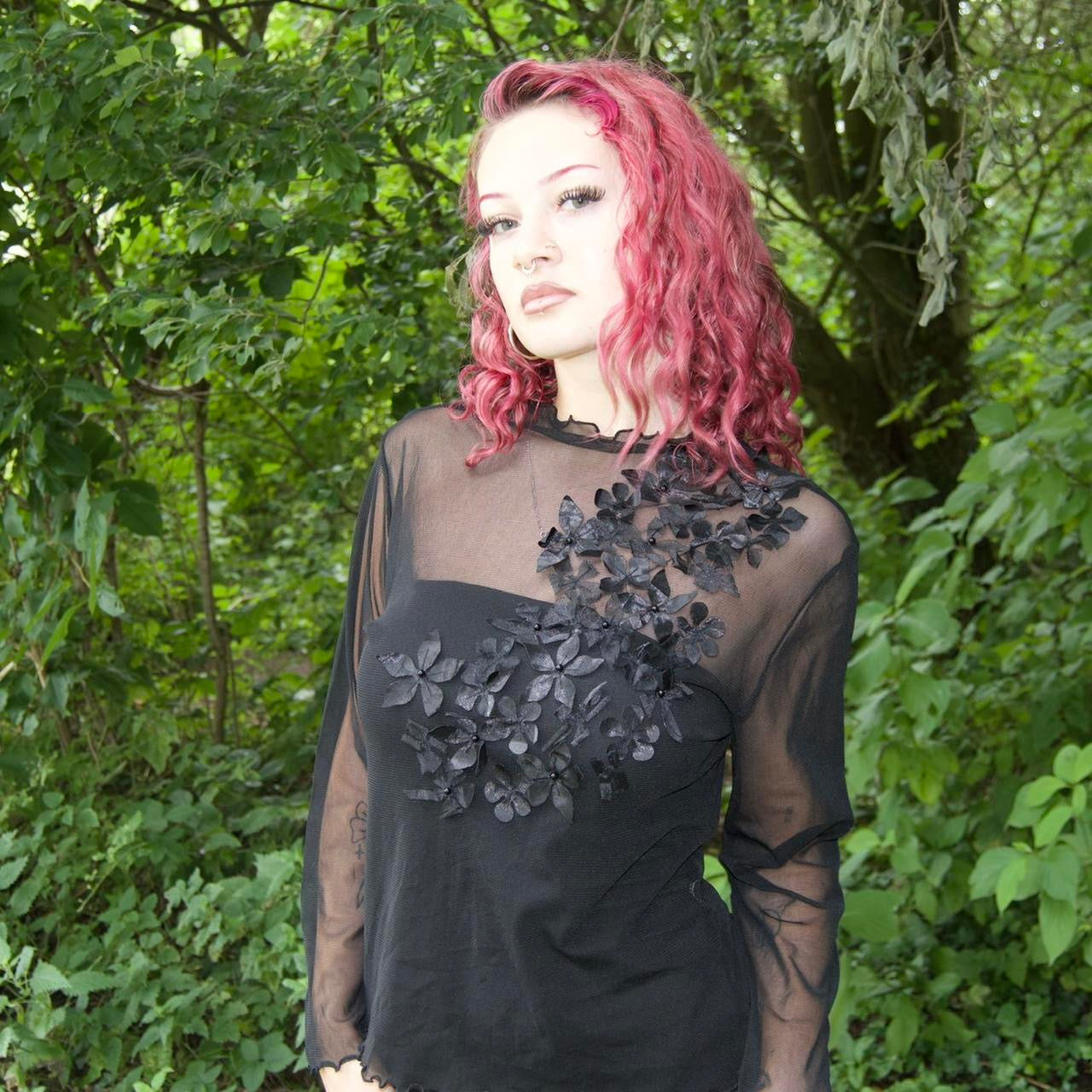 Black long sleeve mesh top with floral embroidery - doesn’t come with undergarments.