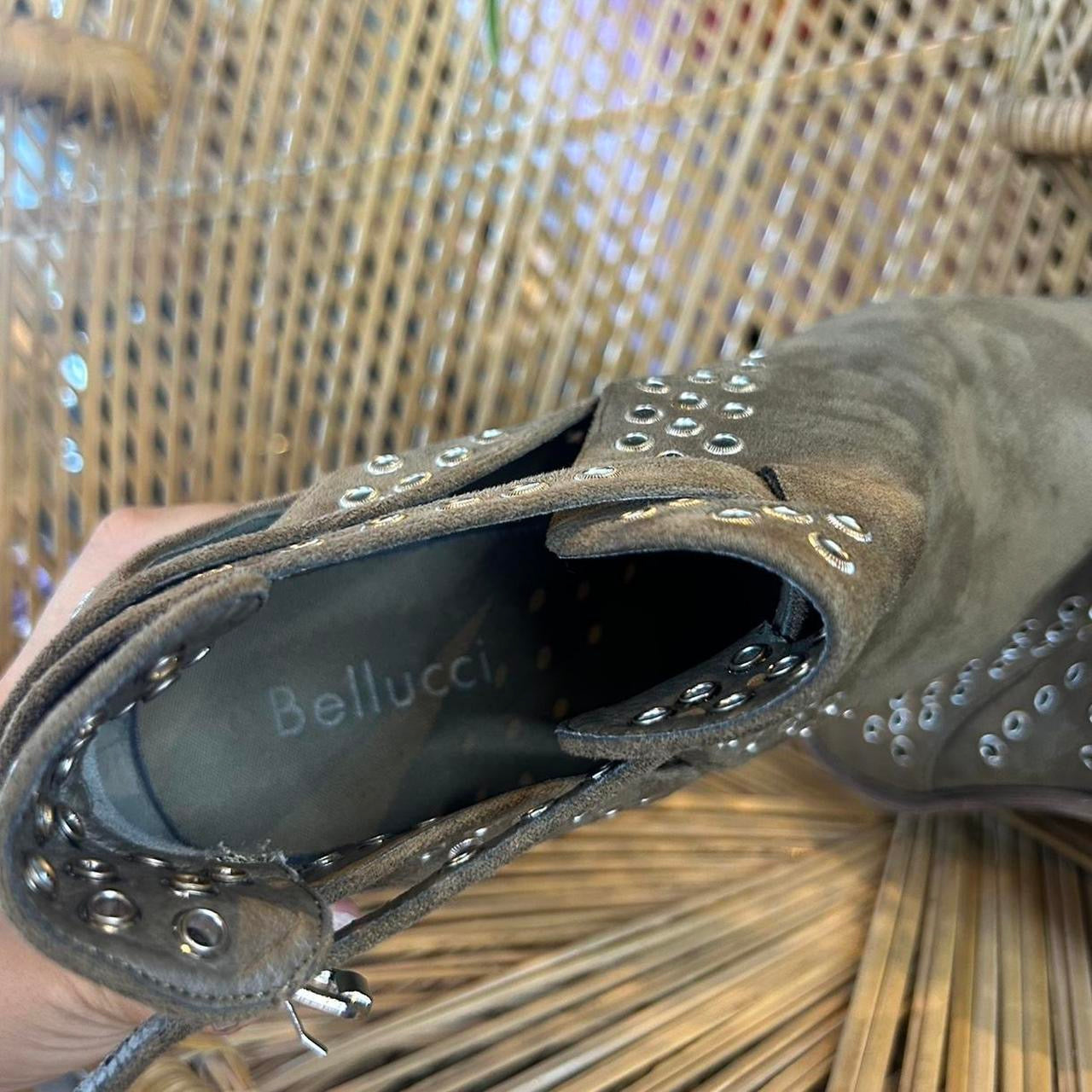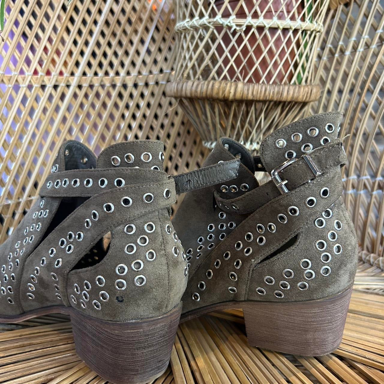 Khaki suede Bellyucci low western boot with eyelet detail. Size 7